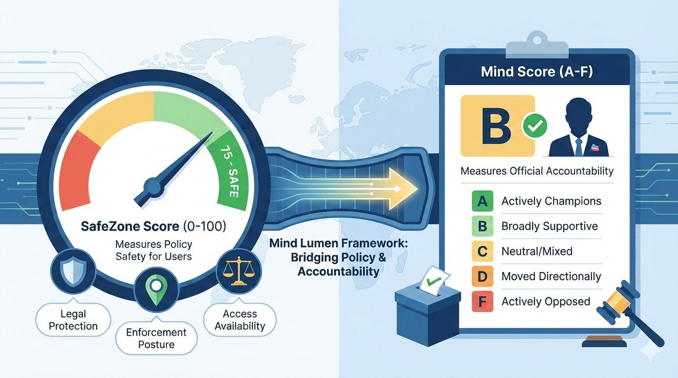 When you look up your county in Mind Lumen’s framework, you will see the SafeZone for the place and the grades for the people who govern it. Both are designed to update as conditions change — an election, a vote, a reversal, a new bill. The scores are living numbers. The grades are based on public records.