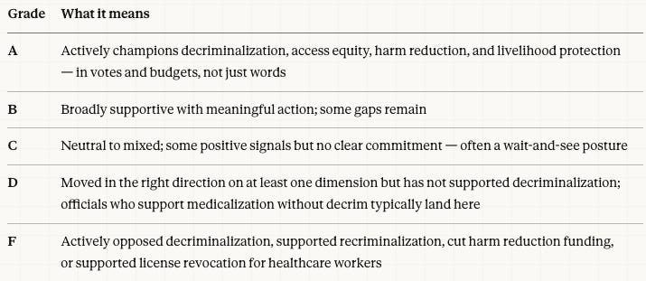 Because New Mexico’s officials haven’t reversed anything. Governor Lujan Grisham and the legislators who passed SB 219 score in the D range — not a passing grade, but meaningfully above F. They moved forward — imperfectly, in the wrong model (medicalized-only), but with genuine intent and no prior betrayal on their record. The trajectory is positive. The city councils in Santa Fe and Albuquerque have been discussing local reform. No one passed a decrim law and then repealed it.
